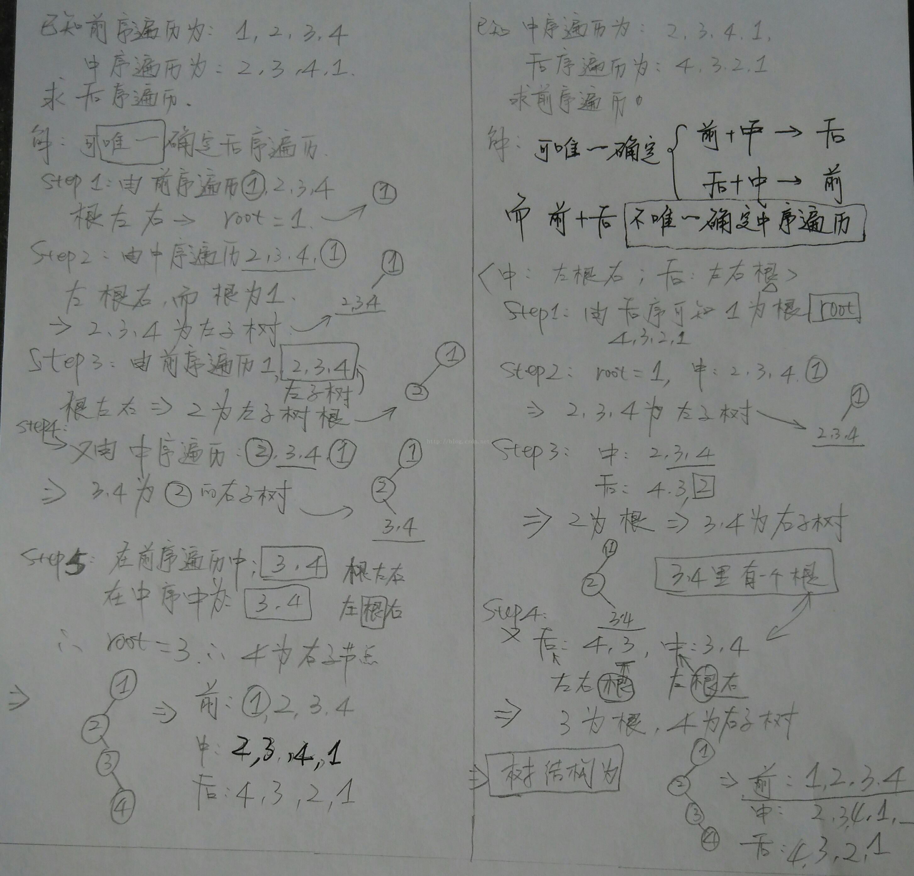 1. 已知前序和后序遍历,不能唯一确定中序遍历;