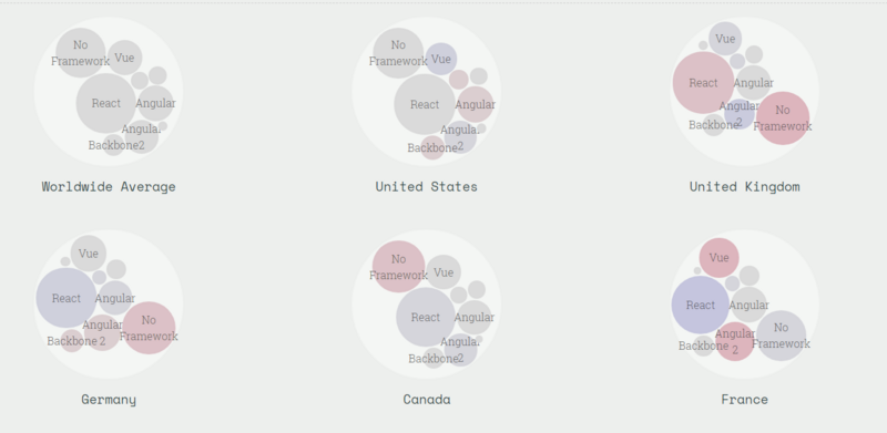 2017年,react发展的迅猛,vue更是扮演框架黑马的角色,而angular虽然关注度不如以前,但是不容忽视!在2017的调查报告里面可以看到,趋势基本上是react已经占据主流,不使用框架位居第二,angular1,angular2分列三四。