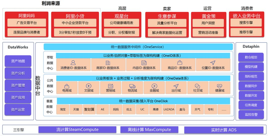 阿里提到的很多数据产品,无论是DataWorks,Dataphin还是OneService,都是偏后端的数据产品,它们其实属于数据价值链的中段,而真正能直接创造价值的数据产品,则是上面图示中的阿里妈妈、阿里小贷、观星台、生意参谋、黄金策、嵌入业务中台等等。