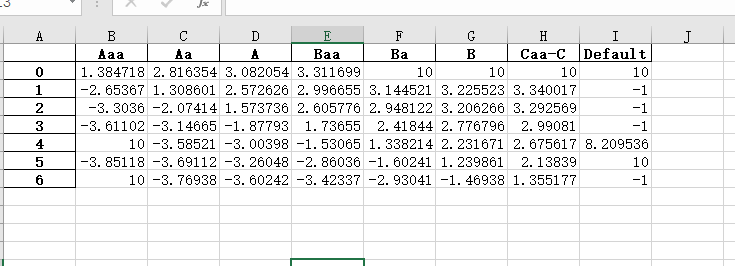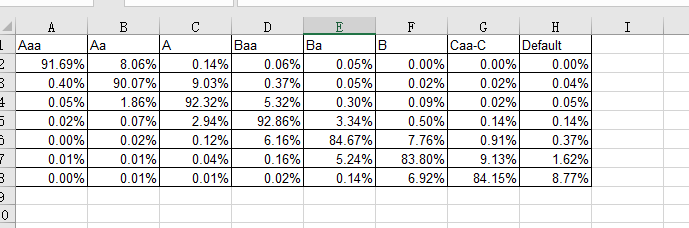 name=['Aaa', 'Aa', 'A', 'Baa', 'Ba', 'B', 'Caa-C', 'Default']