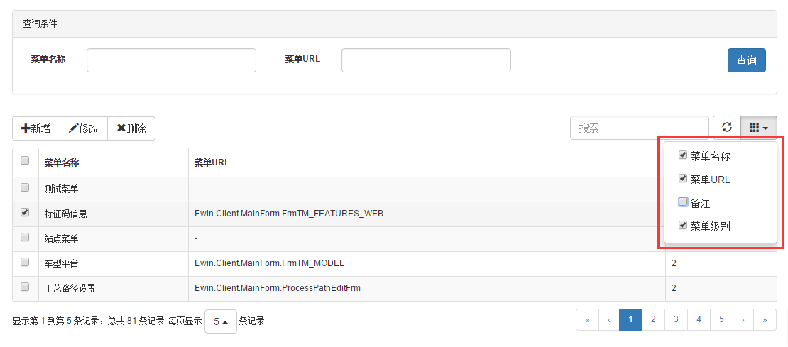 @{ Layout = null; } <!DOCTYPE html> <html> <head> <meta name="viewport" content="width=device-width" /> <title>BootStrap Table使用</title> @*1、Jquery组件引用*@ <script src="~/Scripts/jquery-1.10.2.js"></script> @*2、bootstrap组件引用*@ <script src="~/Content/bootstrap/bootstrap.js"></script> <link href="~/Content/bootstrap/bootstrap.css" rel="stylesheet" /> @*3、bootstrap table组件以及中文包的引用*@ <script src="~/Content/bootstrap-table/bootstrap-table.js"></script> <link href="~/Content/bootstrap-table/bootstrap-table.css" rel="stylesheet" /> <script src="~/Content/bootstrap-table/locale/bootstrap-table-zh-CN.js"></script> @*4、页面Js文件的引用*@ <script src="~/Scripts/Home/Index.js"></script> </head> <body> <div class="panel-body" style="padding-bottom:0px;"> <div class="panel panel-default"> <div class="panel-heading">查询条件</div> <div class="panel-body"> <form id="formSearch" class="form-horizontal"> <div class="form-group" style="margin-top:15px"> <label class="control-label col-sm-1" for="txt_search_departmentname">部门名称</label> <div class="col-sm-3"> <input type="text" class="form-control" id="txt_search_departmentname"> </div> <label class="control-label col-sm-1" for="txt_search_statu">状态</label> <div class="col-sm-3"> <input type="text" class="form-control" id="txt_search_statu"> </div> <div class="col-sm-4" style="text-align:left;"> <button type="button" style="margin-left:50px" id="btn_query" class="btn btn-primary">查询</button> </div> </div> </form> </div> </div> <div id="toolbar" class="btn-group"> <button id="btn_add" type="button" class="btn btn-default"> <span class="glyphicon glyphicon-plus" aria-hidden="true"></span>新增 </button> <button id="btn_edit" type="button" class="btn btn-default"> <span class="glyphicon glyphicon-pencil" aria-hidden="true"></span>修改 </button> <button id="btn_delete" type="button" class="btn btn-default"> <span class="glyphicon glyphicon-remove" aria-hidden="true"></span>删除 </button> </div> <table id="tb_departments"></table> </div> </body> </html>
