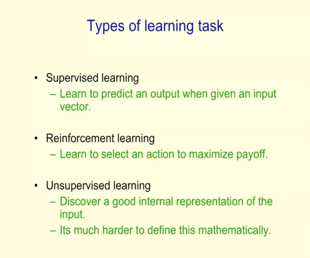 演讲一开始,Hinton 先介绍了三种学习任务:监督学习、强化学习和无监督学习,并重点介绍了无监督学习的必要性。