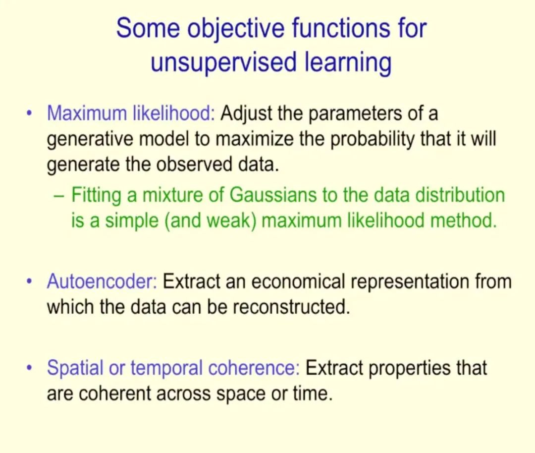 无监督学习经过怎样的发展呢?Hinton 为我们介绍了无监督学习中的常见目标函数。