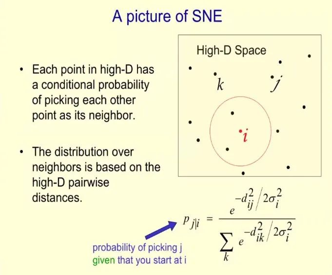 下图为 SNE 的示意图,其中高维空间的每个点都有选择其他点作为其邻域的条件概率,并且邻域分布基于高维成对距离(pairwise distance)。