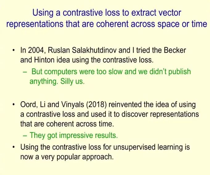 最后,Hinton 提出使用对比损失(contrastive loss)来提取空间或时间一致性的向量表示,并介绍了他与 Ruslan Salakhutdinov 在 2004 年尝试使用对比损失的探索,以及 Oord、Li 和 Vinyals 在 2018 年使用对比损失复现这种想法,并用它发现时间一致性的表示。
