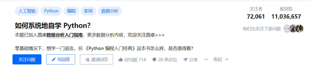 这是我在知乎关注的一个问题,关于如何系统地自学python?累计有1103万多的浏览。