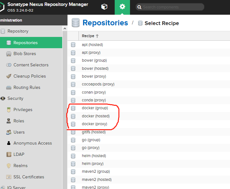 点击 Repository下面的Repositories – Create repository – docker(hosted) :