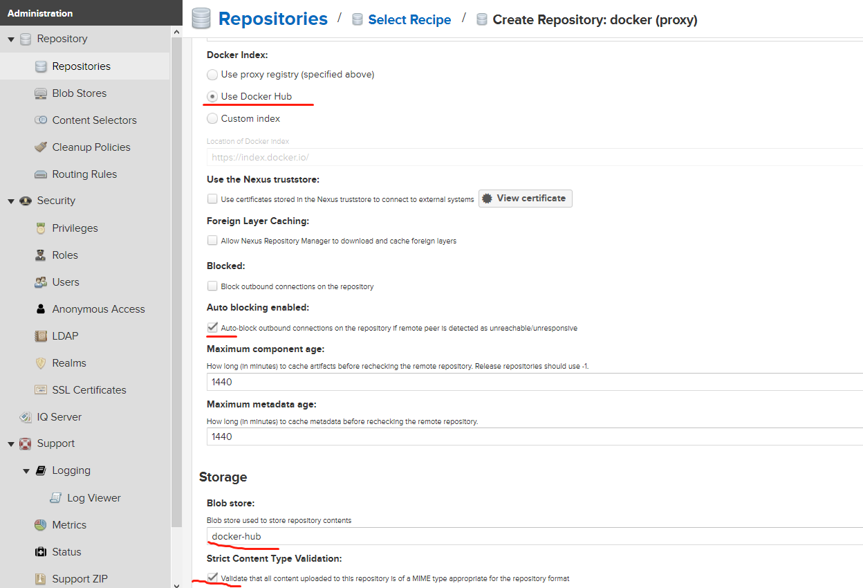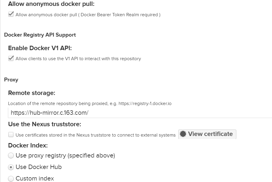 Remote Storage: docker hub的proxy,这里填写: https://hub-mirror.c.163.com/ 这个是网易镜像仓库的链接