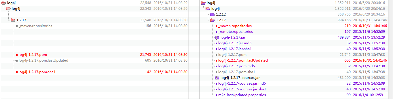 然后,具体对比一下其中的log4j.jar文件夹;具体如下图:表示看不懂,我也是初看这个maven,还没看完呢,虽然项目在用maven,但是却不是很清楚。