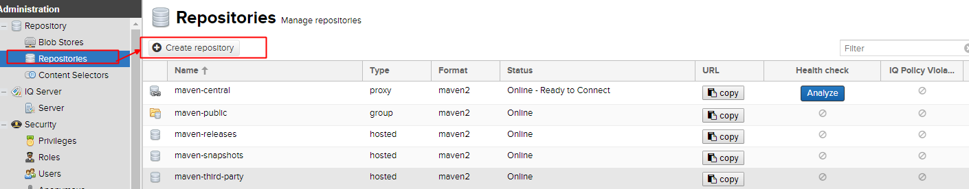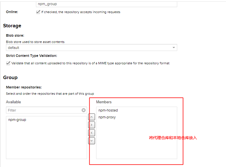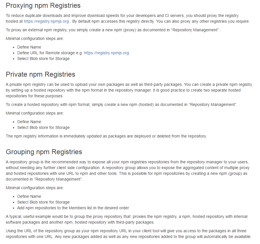 存储库组是将所有npm注册表存储库从存储库管理器公开给您的用户的推荐方式,而不需要任何其他客户端配置。存储库组允许您将多个代理和托管存储库的聚合内容公开为一个URL到npm和其他工具。这可以通过创建一个新的npm(组),如“存储库管理”中所述,用于npm存储库。