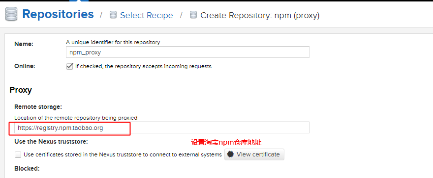 要代理外部npm注册表,您只需创建一个新的npm(代理),如“存储库管理”中所述。