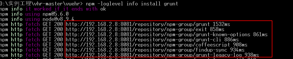测试仓库是否生效 npm -loglevel info install grunt