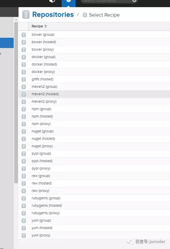 这样就会看到Nexus 3支持的repository类型。对于Java开发者maven2的应该就很熟悉了。