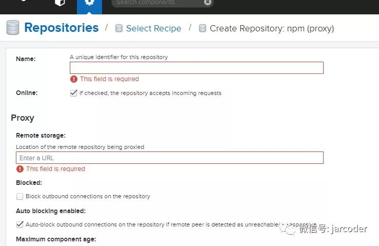 在proxy类型的配置界面,发现里面的Name、Remote storage是必填的。Name可以随便填。Remote storage需要填类似maven中央库的地址,这里npm的选择淘宝的私服地址