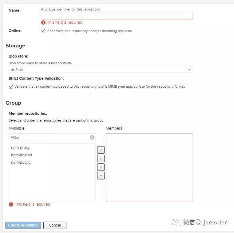 在group配置中,name同样是必须的。此外还多了一个members的配置,将左侧的npm-hosted,npm-proxy添加到右侧的members中,这样就可以通过group同时访问npm-hosted,npm-proxy中的资源了。