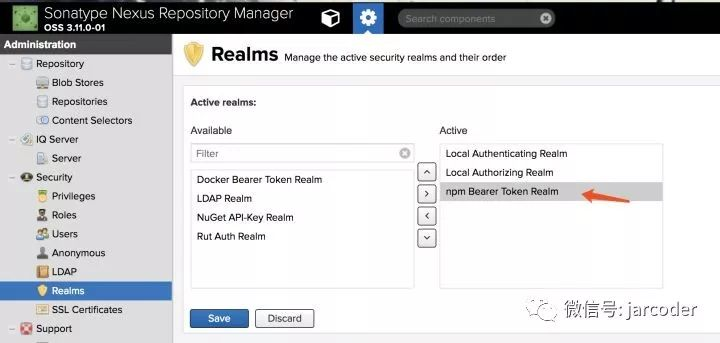 首先,需要配置权限,将npm Bearer Token Realm启用。