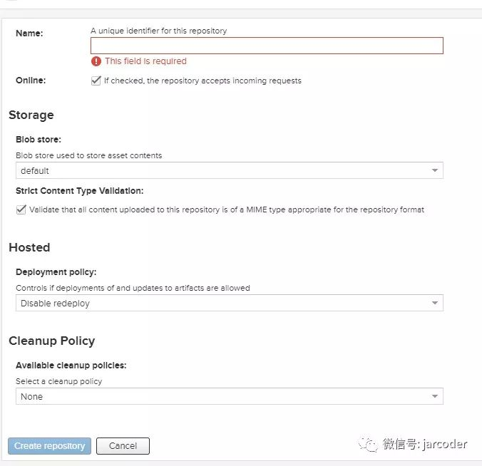 仔细观察会发现,每一种repository都包含三种类型可以创建, group, hosted,proxy。下面分别对每种做说明: