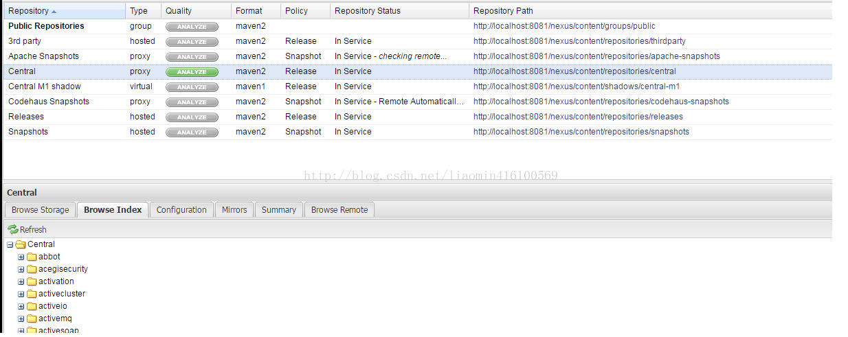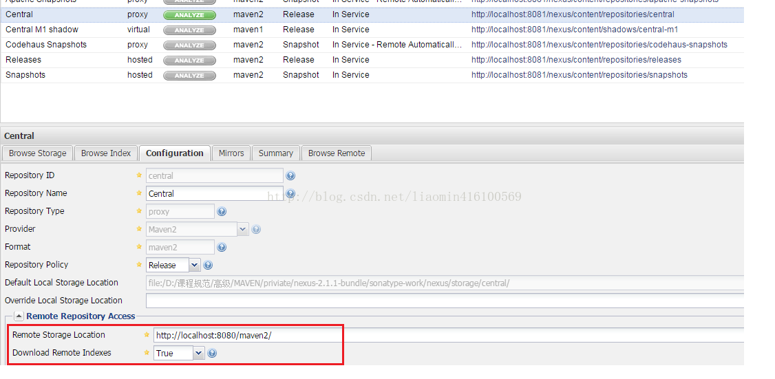 点击central点击下面的配置选项 修改nexus上更新索引的位置 会自动更新索引