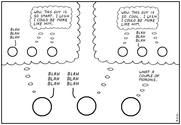 上大学以前的人因为没有专业,所以还不怎么崇拜权威,大不了追追歌星,影星,球星啥的。而进了大学之后,就会开始对本领域的权威耳濡目染。一遍,两遍,一千遍的听到同学们仰慕某“牛人”或者“大师”的名字,虽然从来没亲身见过,不知不觉就对这人产生了崇拜心理,然后自愧不如。不知不觉的,自己也开始附和这些说法,不自觉地提到这些大师的名字,引用他们说的话作为自己的行动指南。