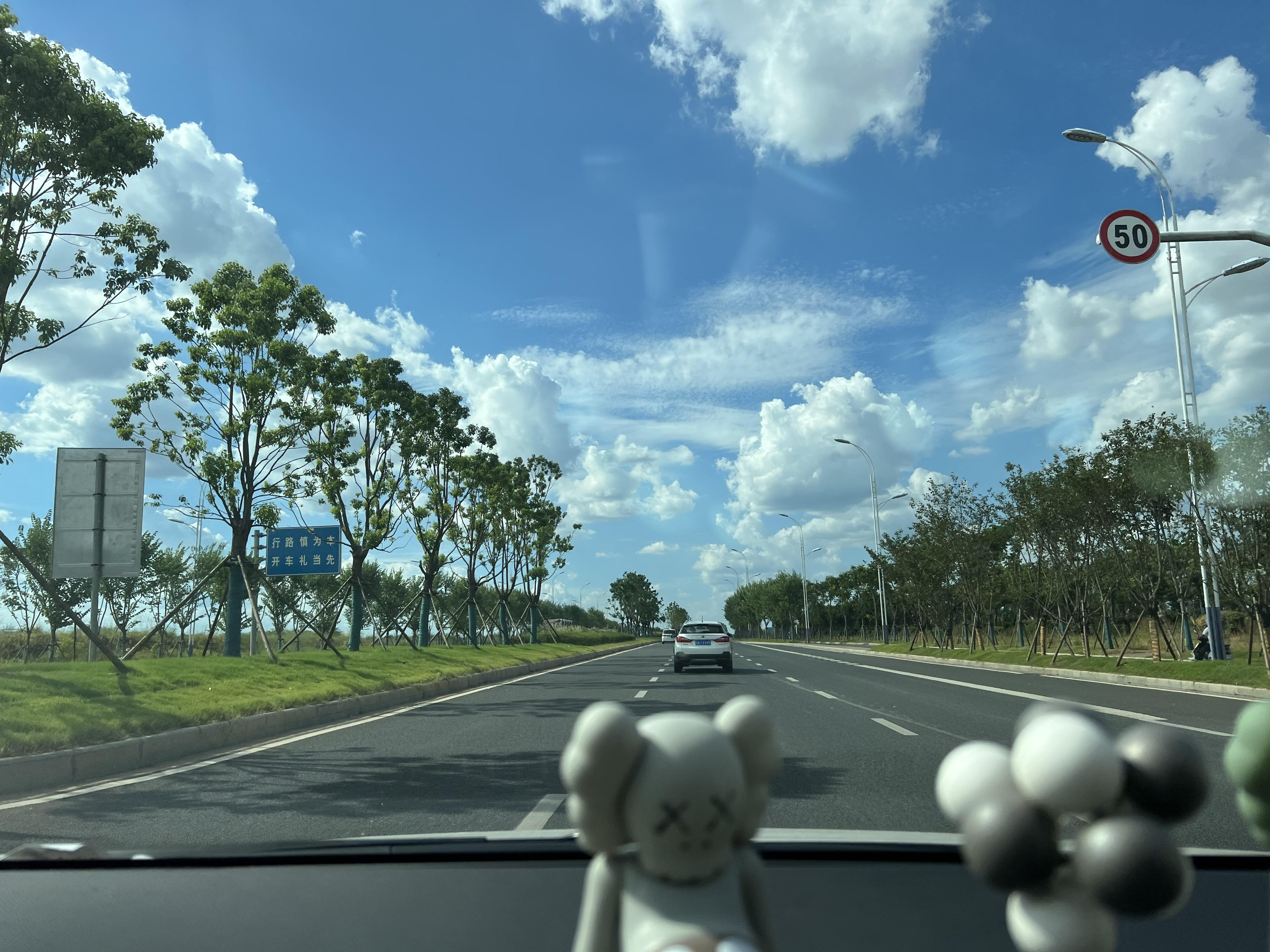 "下课啦",我顺手接过她手上的课本, 随后提上行李,便与她一同上车。回家的路,蓝天白云。她的副驾驶上回不知道被那个"胖子"坐过,位置调的太靠后,于是被她说我为啥隔她坐这么远,"那我调前点来",我的左肩特地往她那侧靠了靠;她不太敢分心与我说话,毕竟安全第一。