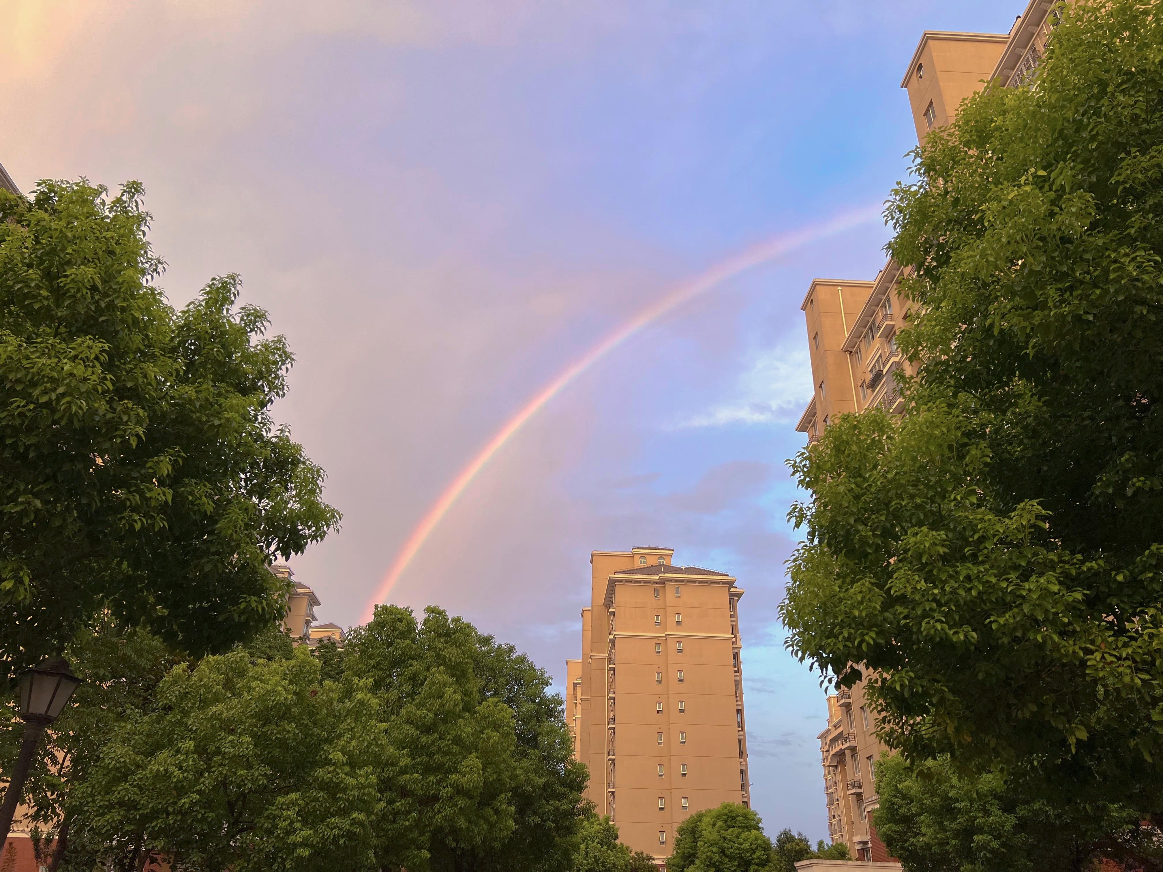这是九月份某天的一个傍晚,我刚下班,欣然抬头,天上竟挂着一轮彩虹,原来"斯人若彩虹,遇上方知有!",遇见你,便是上上签。