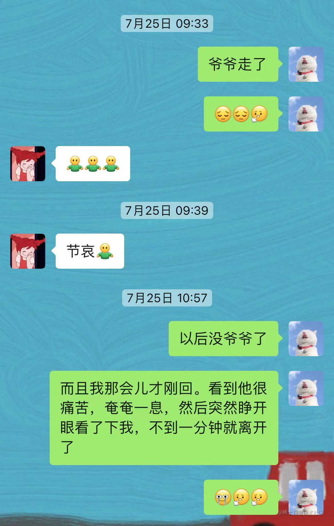 7月25号一早就接到爷爷不好的消息,我一行人便火急火燎的赶回去探望,非常的不幸,由于噩耗一般无法接受,他就这么永远的离开了我们,一个人去了天国,内心悲痛不已;愿你在天有灵,能庇佑你的后代们一生幸福美满。我目睹着他离开,临走前他还睁眼看了看我,我知道你一定是在等我,要是知道这是最后一面,那我上次说啥也要多陪陪你。