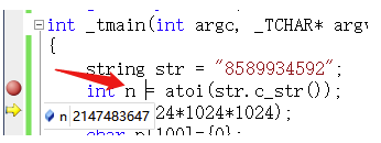 通过单步调试,发现int越界,atoi处已经越界,int范围“-2147483648~2147483647”(32位),可看出最大2开头十位数,然而实际已经8开头十位数了,然而编译器并没有报错,直接给最大数,运算后为1