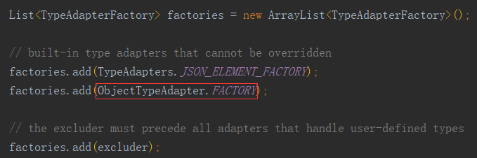 ObjectTypeAdapter 在创建的 Gson 对象中是不存在的,其使用了内部的工厂对象(FACTORY)动态创建。