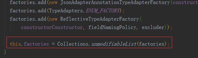 因为在 gson 的创建过程中,factories 通过 Collections 的方法变为了不可修改对象,所以我们需要将其真实属性获得才能进行修改。