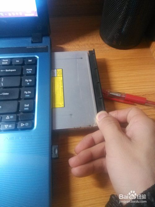 2、我们采取的办法是拆掉光驱的办法,然后把光驱的位置当成SSD放置的位置,个人感觉光驱在日常生活中使用到的概率几乎为零(当然也还有补救的办法,将步骤四)。首先是拆掉光驱,光驱拆掉的位置很好拆,以宏基为例,只要拆掉后面的螺丝,就直接可以将其整体的拔出开。