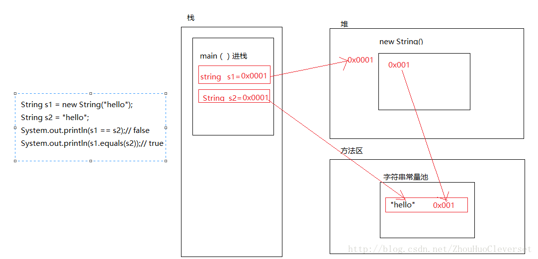 - 即s1中存的是堆中分配的空间,堆中分配的空间中存的是字符串常量池中分配空间存放”hello”的空间的地址值。而s2中之间存的是字符串常量池中分配空间存放”hello”的空间的地址值。