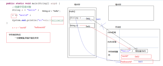 // 测试类 public class Demo01 { public static void main(String[] args) { String s1 = "hello"; String s2 = "world"; String s3 = s1 + s2; String s4 = s1.concat(s2); System.out.println(s3);// helloworld System.out.println(s4);// helloworld } }
