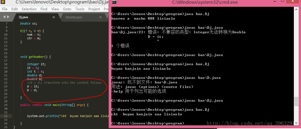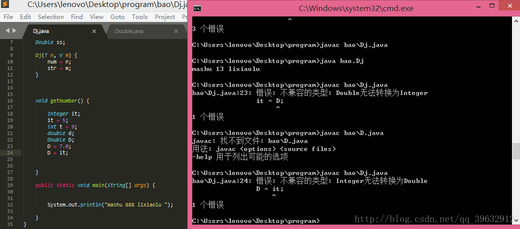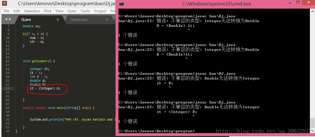 对于以对象形式存在的数据类型,不可以进行强制转换,否则不能通过编译,下面的图片分别测试了由低级向高级的强制转换,和由高级向低级的强制转换。。。。
