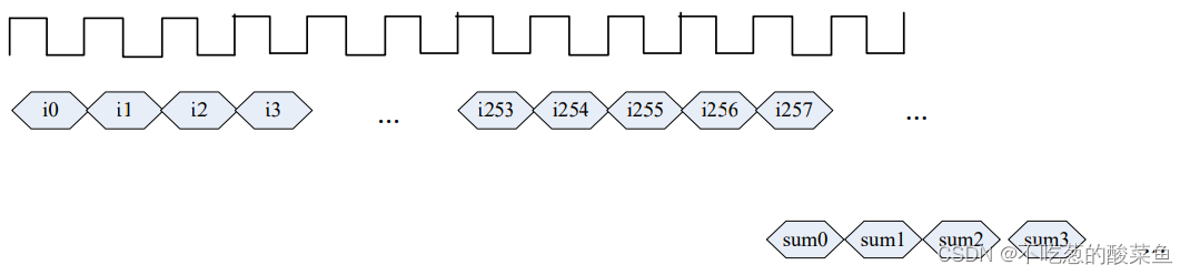 输入为 i0,i1,i2,…,i253,i254,….占 1 个时钟周期, 输出 sum0 为 i0 +i2+….+i254 的加和值(隔点相加), sum1 为 i1+i3+….+i255,sum2 为 i2+i4+….+i256,如此下去,每个输出占一个时钟周期 Sum0 和 i0 的相对延时关系任意即可。假设输入 i0,i1,i254,…为 8 比特值, 输出 sum 请选择认为不会损失精度且合适的位宽,并用你认为的最省资源的方式用 verilog 语言实现上述要求。