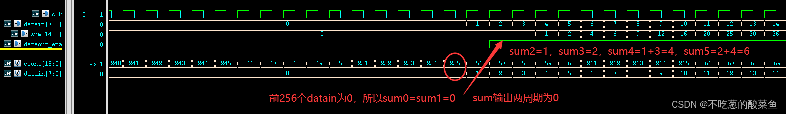 为了方便看结果的正确性,让datain的前256个周期都为0,这样输出的sum0和sum1都为0,然后再让datain为正整数序列递增。 从输出结果可以看到,和我们预期一致,sum0=sum1=0,sum2=sum0-i0+i256=0-0+1=1;sum3=sum1-i1+i257=0-0+2=2,以此类推。