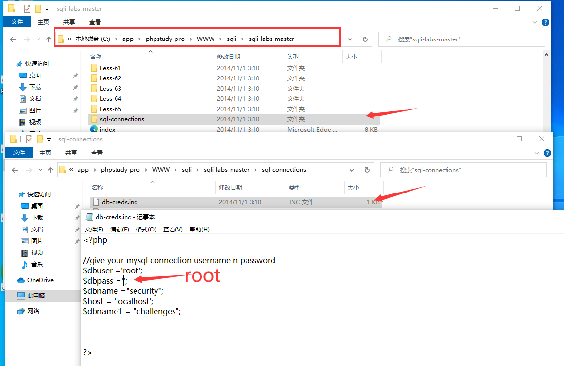 phpstudy_proWWWsqlisqli-labs-mastersql-connections下的db-creds.inc文件进行编辑