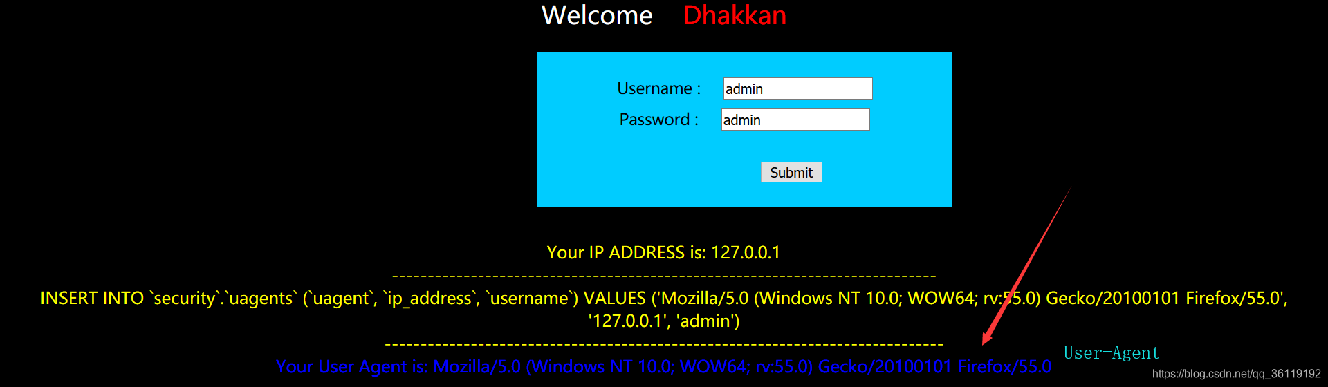 我们访问 http://127.0.0.1/sqli/Less-18/ ,页面显示一个登陆框和我们的ip信息
