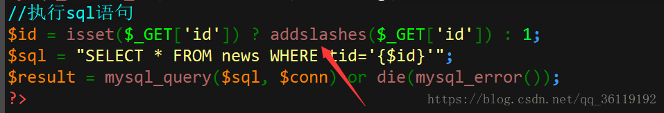 首先,我们来看一下1的源码,这对用户输入的id用 addslashes() 函数进行了处理,而且是当成字符串处理。