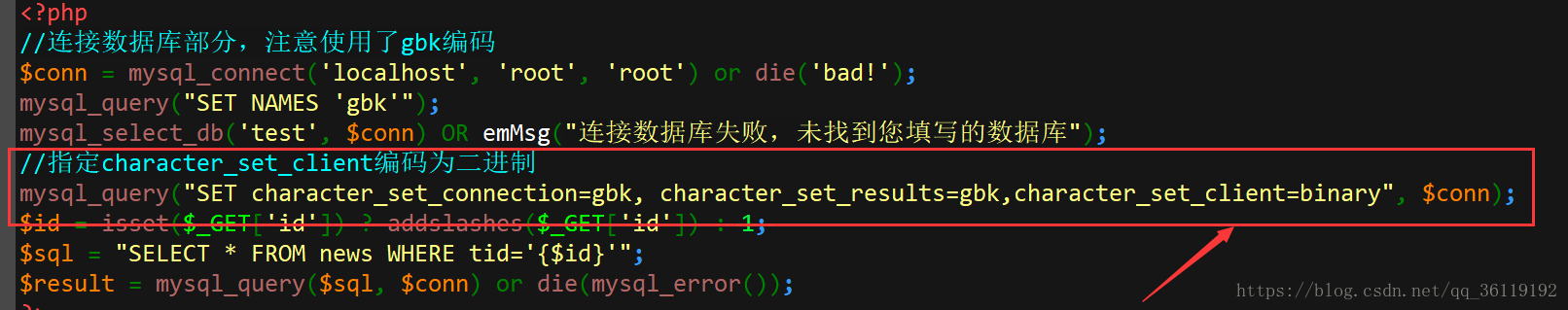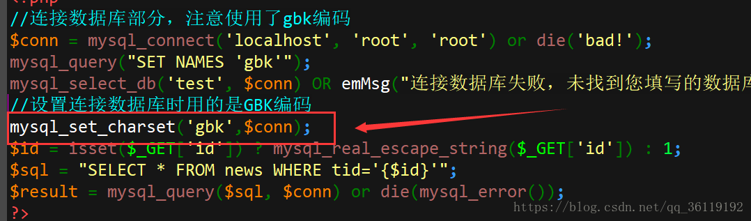 发现还是能进行宽字节的注入。那么这是为什么呢?原因就是,你没有指定php连接mysql的字符集。我们需要在执行SQL语句之前调用 mysql_set_charset 函数,并且设置当前连接的字符集为gbk。