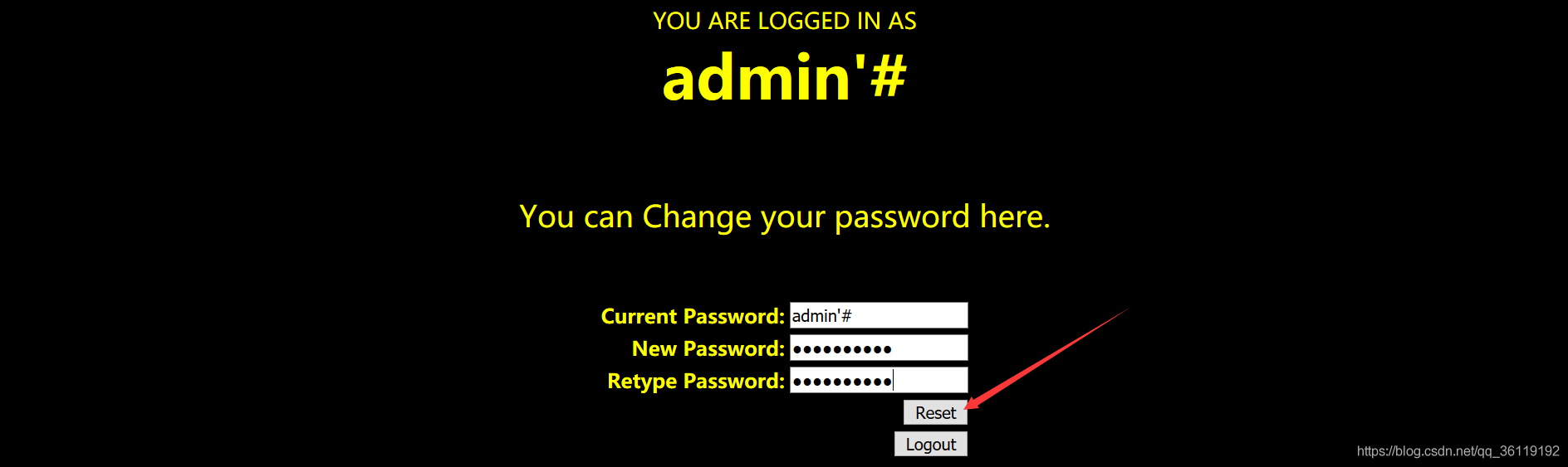 当我们提交用户名 admin'# 修改密码为 aaaaaaaaaa 的时候,这条SQL语句就变成了下面的语句了。