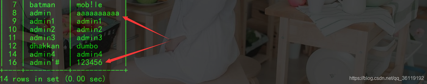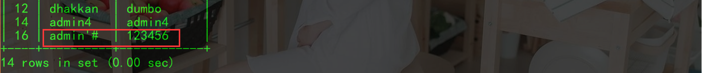我们查看数据库,发现用户 admin'# 的密码并没有修改,而且 admin 用户的密码修改为了 aaaaaaaaaa